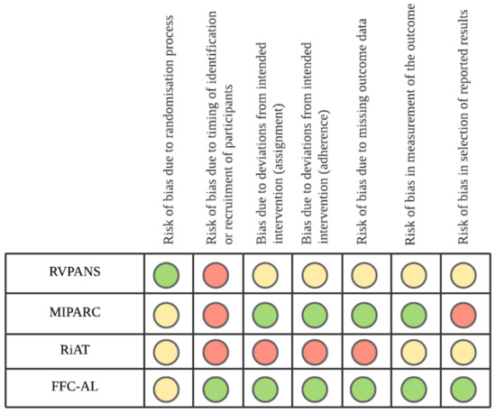 RoB2 (Risk of Bias 2 ) assessment of bias for cluster RCTs (randomized controlled trials). Retirement Village Physical Activity and Nutrition for Seniors (RVPANS); Multilevel Intervention for Physical Activity in Retirement Communities (MIPARC); Residents in Action Trial (RiAT); Function Focused Care—Assisted Living (FFC-AL). Green = Low Risk of bias; Yellow = Unclear Risk of bias; Red = High Risk of bias.