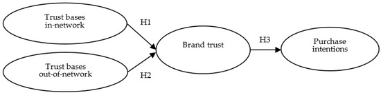 In this study, three key points are summarized in the literature to better understand consumers’ purchasing behaviors toward products related to the biotech industry. Firstly, with respect to the mechanism of developing brand trust in Taiwan, we argue that consumers in the biotech industry develop brand trust by transferring and referring to family members and acquaintances within the relationship network and incorporate institutional and professional considerations outside the relationship network to jointly construct consumers’ imagination of trust in biotech brands. Secondly, previous studies have only focused on the concept of trust and not on the special characteristics of the biotech industry, and there is no mention of the concept of acquaintances of consumers in the biotech industry in Taiwan. Thus, we will conduct in-depth interviews and focus group discussions to understand the biotech industry in Taiwan, construct a prototype of the relationship network of consumers in the biotech industry in Taiwan, and then conduct empirical evidence. Finally, based on relevant surveys and previous literature, this study concludes that trust is a major factor affecting consumer purchase intention in the biotech industry (Figure 1). Therefore, after compiling the above arguments, this study proposes the following conceptual or structure model based on prior studies [15,16] in the hope to make concrete contributions to both theory and practice through a qualitative and then empirical research approach. Three hypotheses were proposed based on prior studies as follows. Two structures, including a measurement model (i.e., Confirmatory Factor Analysis; CFA) and a structural mode, in which multiple equations could be estimated simultaneously with four latent constructs.
