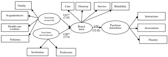 Finally, the study collected samples in two different ways. First, we collected questionnaires from women who had heard of Company X at Mom’s Class and Baby & Mommy Expo in Taipei, Taichung, Kaohsiung, and Hualien. In addition, we also distributed online questionnaires, and finally, we obtained 239 valid samples. We adopted AMOS to analyze the structural equation model, and the CFA results of the measurement pattern showed that all dimensions of the questionnaire met the criteria in terms of factor loadings, CR values, AVE values, and discriminant validity, which again verified the reliability and validity of the questionnaire. In respect of the goodness-of-fit of the overall model, this study also met the criteria of the previous structural equation model [45], indicating that the model can be empirically validated. This implies that our proposal that the transfer of trust from family and acquaintances within the relationship network of biotech consumers and the direct influence of profession and institution outside the relationship network jointly construct the trust of biotech brands in Taiwan, which in turn affects consumer purchase intention, is fully supported. The path analysis results further showed that the behavioral intentions of consumers in the biotech industry in Taiwan are basically related to their brand trust, and to construct such a brand trust, the transfer of trust within the consumer relationship network is more crucial than the institutional and professional bases outside the relationship network.