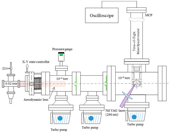 Aerosols are introduced through an inlet orifice with an inner diameter of 100 μm and a flow rate of 0.07 L/m, and, then, particles are focused into a particle beam of approximately 1 mm diameter by passing them through the aerodynamic lens system [28,29]. The aerodynamic lens is used as an interface to introduce aerosols from the atmosphere to the high vacuum system, and a collimated particle beam is generated for successful detection by the ionization laser. After exiting the aerodynamic lens, the particles achieve terminal velocity distribution, which is a function of their aerodynamic diameters during supersonic expansion [30,31,32]. A prototype aerodynamic lens is constructed, consisting of 12 sequential coaxial cylindrical orifices with varying diameters of 16, 7, 6, 5, 4, 5, 1.5, 14, 8, 5, 4.5, and 2.72 mm at the exit nozzle. The distance between the orifices is 40 mm. The particle beam diameter is much smaller than the diameters of the nozzle or skimmer. This can focus the particles onto the centerline of the orifices. The aerodynamic lens is mounted on the X-Y manipulator, which is used to adjust the direction and position of the particle beam, maximizing the transmission of particles to the laser ionization position.