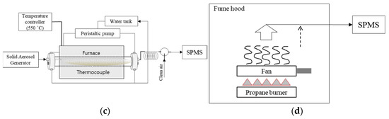 Figure 2 shows various systems for generating combustion aerosols (diesel engine, biomass burning, coal burning, and meat burning). The particle generation systems were described in detail in our previous papers [33,34,35]. Briefly, diesel engine exhaust particles were produced from a diesel generator (192FC, Hi-earns, Changzhou, China), as shown in Figure 2a. The diesel generator (498 cc) was operated in idle mode at 3000 rpm. The tailpipe of the generator was directly exposed to the atmosphere, and an aerosol flow including diesel engine exhaust particles was sampled near the tailpipe. Then, aerosol flow with a flow rate of 1 L/m was mixed with particle-free air with a flow rate of 100 L/m to achieve dilution and cooling. The dilution ratio was around 100. For the generation of biomass burning particles, a biomass-burning chamber was constructed, as shown in Figure 2b. It consists of a combustion stove (0.8 m × 0.8 m × 0.8 m) and a dilution chamber (1.5 m × 1.5 m × 1.5 m). Approximately 25 g of rice straw, which was collected in an agricultural area of South Korea (Yeosu), was burned in the combustion stove. The rice straw is a major type of agricultural waste in South Korea and is usually burned intensively on farmland after harvest [36,37,38], causing severe local haze events. Coal combustion particles were produced by a coal-burning system (see Figure 2c) comprising a high-temperature tube furnace (Lindberg/Blue M, HTF55322C, Thermo Electron Corp., Franklin, MA, USA) and a dilution chamber. Bituminous coal was obtained from a coal power plant in South Korea (Korea South Power, Busan, Korea), and it was pulverized and screened (<75 μm) before being burned. The pulverized coal was fed into the tube furnace, where it was burned at a temperature of 550 °C. Then, coal burning particles were diluted approximately 100 times prior to the measurement. Meat (pork) cooking aerosols were produced by burning or grilling a piece of pork (belly part) with a propane burner, as shown in Figure 2d. Pork containing a high percentage of fat, which is burned on a pan, is a popular food in South Korea. Most of the smoke was exhausted into the fume hood, and an aerosol flow was sampled and mixed with dilution air before being measured with the SPMS. A series of diffusion dryers packed with silica gel and denuders (custom made) were installed in the aerosol flow line before being measured with the SPMS to remove water and volatile organic vapors from the aerosol flow. The scanning mobility particle sizer (SMPS) consisting of a differential mobility analyzer (3080, TSI, Shoreview, MN, USA) and a condensation particle counter (3788, TSI, USA) was used to determine the number size distribution of the generated particles.