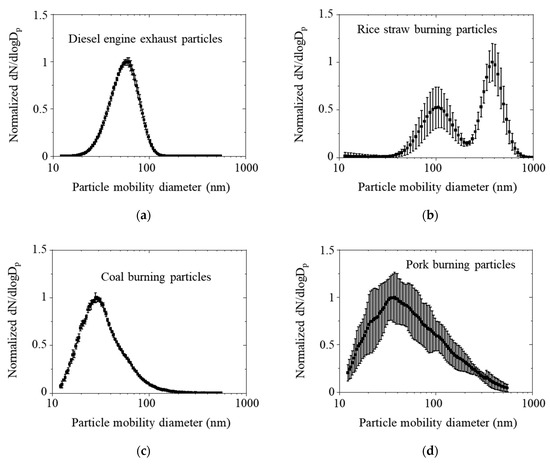 Normalized particle number size distributions for various combustion aerosols are shown in Figure 5. Most of the particles were less than 1 µm (fine particles). The highest number of emissions was observed for the diesel engine exhaust particles with a mode diameter of 60 nm. The particles generated by rice straw burning had a bimodal distribution, and the first peak disappeared with the transition from flaming combustion to smoldering combustion [35]. The coal burning aerosols showed the smallest mode diameter, which was less than 30 nm (27.9 nm). The pork burning aerosols had a higher standard deviation in each size bin because they were generated by a more inhomogeneous burning process than the others.