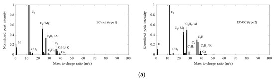 Two types of particles (EC-rich and EC-OC particles) were observed among pork burning emissions, as shown in Figure 6d. The cooking process can contribute to high concentrations of indoor aerosols that affect human health [53]. EC-rich particles (36%) mainly consisted of C1, C2, and C3, as in the diesel exhaust particles but also comprised a small number of OC (e.g., CHx, C2Hx, and C3Hx). Note that the EC-rich particles produced from rice straw burning always had a K (m/z = 39) peak in the single-particle spectra, suggesting that the single-particle mass spectra of the EC-rich particles produced from the diesel engine, rice straw burning, and pork burning somewhat differed. For the EC-OC particles (62%), the OC peaks increased significantly. Organic compounds can include fatty acids in cooking aerosols [53,54].