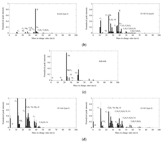 Only one particle type (ash-rich particles) was detected in coal burning emissions, as shown in Figure 6c. They mainly contained Na (m/z = 23), Mg (m/z = 24), Al (m/z = 27), and Ca (m/z = 40), consistent with earlier studies in which coal burning emissions contained a significant amount of minerals [47,48]. Pulverized coal combustion is typically used for the generation of electricity, accounting for around 40% of the world’s electricity [49]. In developing countries, coal is also used for household heating and cooking, which has adverse health effects on indoor residents [34,50,51,52].