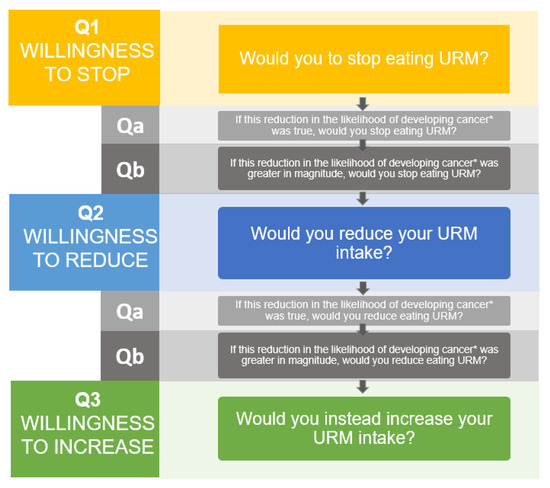 Questions framework for the direct-choice cancer-incidence exercise for unprocessed red meat. Abbreviations: URM = unprocessed red meat; Q1 = Question 1; Q2 = question2; Q3 = Question3; Qa = Question a; Qb = Question b. Q1–Q2–Q3: Willingness to stop, reduce and increase meat intake was based on a 7-point Likert-scale with 1 (meaning definitely not) and 7 (meaning definitely yes). Qa: Willingness to stop and reduce meat intake with higher certainty was based on a 7-point Likert-scale with 1 (meaning definitely not) and 7 (meaning definitely yes). Qb: Willingness to stop and reduce processed meat consumption with a larger risk reduction was formulated as a multiple-choice question. This logic of questions was applied for both types of meat and for both cancer-incidence and cancer-mortality scenarios. * For the mortality scenarios “developing cancer” was changed into “dying from cancer”.