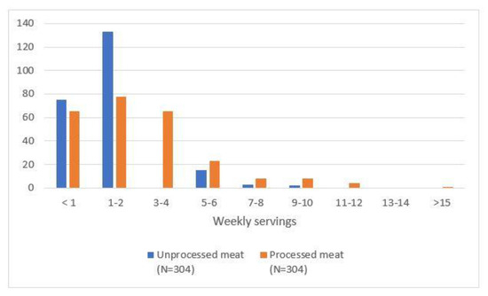 Many participants reported consuming less than three servings of meat per week (76% of URM and 57% of PM), 24% of participants consumed three or more servings of URM and 43% of PM. Figure 2 presents the meat-consumption frequency behaviour. The type of URM most frequently consumed was beef or veal (76.0%) and, for PM, Serrano ham or shoulder ham (71.4%) (See Supplementary Materials: Figures S1 and S2). The three main reasons for meat consumption among the participants included flavour, cost and availability, and were similar for URM and PM (See Supplementary Materials: Table S1).