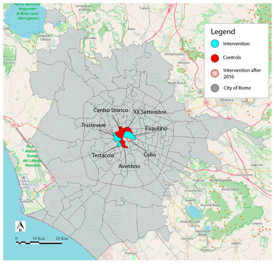 The general population of the study refers to adults over 80 living in an urban context. The sample included 7 urban zones in the first municipality of Rome and considered aggregated data related to the over-80 population. Zones have been included in the intervention group if the LLE program was present and in the control group if they belonged to the same municipality but the program was absent. The attribution of zones to the intervention or control group is not randomized: the Community of Sant Egidio initiated the LLE program to counteract loneliness in the Trastevere zone, where the organization’s headquarters are located. The program was then replicated in the other urban zones of the same municipality, following a criterion of feasibility and a need assessment. The areas included in the two groups are represented in Figure 1, reporting the map of the urban zones composing the Rome I municipality.