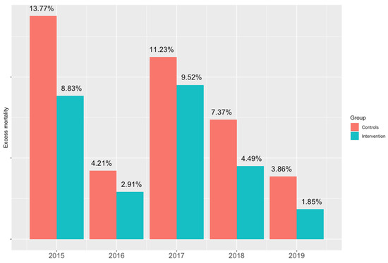 The main outcome, i.e., the excess mortality rate compared to 2014 in which there were no heat waves, is represented in Figure 2. For urban zones included in the intervention group, the excess mortality rate was lower than the one registered in the control group for the years observed.