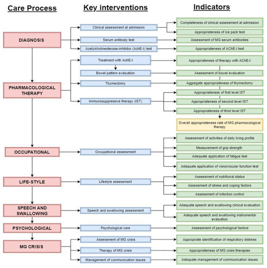 Figure 3 shows the list of the key interventions and of the relative process indicators. We identified 14 key interventions as follows: diagnostic process (n = 3); pharmacological therapy (n = 4); speech and swallowing (n = 1); occupational, physical, and respiratory (n = 1); psychological assessment (n = 1); lifestyle assessment (n = 1); and myasthenic crisis (n = 3) assessment and management processes. An example of a key intervention is fully described in the supplementary materials (Figure S6). The 24 process indicators included the measurement of the performance of the diagnosis and assessment (4 indicators), the pharmacological therapy (7 indicators), the speech and swallowing assessment (2 indicators), the occupational assessment and management (4 indicators), the psychological assessment (1 indicator), the life-style assessment (3 indicators) and the assessment and management of myasthenic crisis (3 indicators) processes. An example of an indicator is fully described in the supplementary materials (Figure S7).