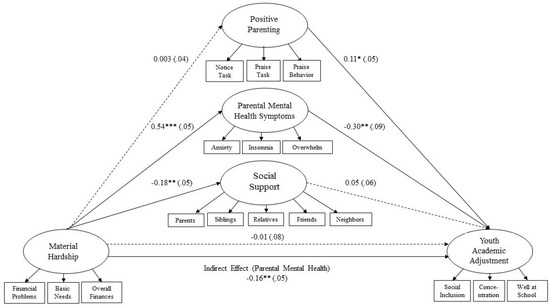 The final model indicated several significant pathways among latent constructs, presented in Figure 2, as well as in Table 2 and Table 3. Standardized coefficients were used to scale construct values using a metric that is more easily interpreted. Material hardship yielded direct positive effects on caregiver mental health (β = 0.54, p < 0.001), with higher levels of material hardship resulting in increased levels of mental health symptomology issues for caregivers. Furthermore, material hardship had direct negative effects on social support (β = −0.178, p < 0.001), indicating that a more severe degree of material hardship predicted lower overall social support from respondents’ parents, siblings, other relatives, friends, and neighbors. Conversely, material hardship did not have a significant effect on either youth academic adjustment (β = −0.014, p = 0.861) or respondents’ positive parenting (β = 0.003, p = 0.952). Caregiver mental health symptomology had a significant direct negative effect (β= −0.301, p < 0.001) on youth academic adjustment, indicating that higher levels of poor caregiver mental health symptomology were associated with lower levels of academic adjustment. Furthermore, positive parenting had a significant direct positive effect (β = 0.115, p < 0.05) on youth academic adjustment, suggesting that parenting practices of noticing, encouraging, and praising good behavior predicted better overall academic adjustment. Respondent social support did not have a significant direct effect (β = 0.051, p = 0.394) on youth academic adjustment. Caregiver mental health was the only variable to have a significant direct effect between both the exogenous (i.e., material hardship) and the endogenous (i.e., youth academic adjustment) variables.