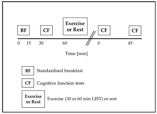 The battery of cognitive function tests consisted of the Stroop test, Sternberg paradigm, and Flanker task, completed in that order. The Stroop test is a measure of information processing and inhibitory control [42,43], the Sternberg paradigm assesses visual working memory [44], and the Flanker task measures attention and inhibitory control [45]. The test battery was completed 30 min pre, immediately post, and 45 min post exercise, and at the corresponding time points on the resting trial. The tests lasted ~15 min and were administered via a laptop computer (Leno ThinkPad T450; Lenovo, Hong Kong). Instructions were presented on screen and were repeated verbally by an investigator prior to the completion of each test. Questions were encouraged, and then confirmation of understanding was sought from participants before proceeding. Each test (and test level) was preceded by 3–6 practice stimuli, and participants received feedback regarding whether their responses were correct or not. The practice stimuli re-familiarised participants with the test and acted to negate any potential learning effects. Participants completed the tests in a classroom and were seated separately to ensure no interaction during the tests occurred. Sound-cancelling headphones were worn, and the lights were dimmed to minimise external disturbances and enhance screen visibility. Participants were instructed to respond to each test as quickly and as accurately as possible, with the outcome variables of interest for all tests being the response time of correct responses (ms) and the proportion (%) of correct responses made. These cognitive tests and testing protocols have previously been used successfully in a similar study population [16,17,35].