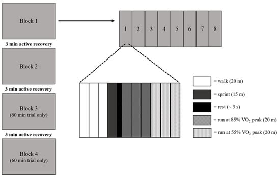 During the exercise trials, participants completed either 30 min or 60 min of high-intensity intermittent running in an adapted form of the Loughborough Intermittent Shuttle Test (LIST) [41]. The LIST was conducted in each participating school’s sports hall and involved participants running between two markers, 20 m apart, to pre-determined speeds dictated by an audio signal. The LIST protocol in the present study consisted of three 20 m shuttles at walking pace, a 15 m sprint followed by rest (8 s total duration), three 20 m shuttles running at 85% VO2 peak, and three 20 m shuttles running at 55% of VO2 peak. This pattern was repeated eight times, lasting ~12 min; this equaled one block (as presented in Figure 2). The 30 min trial consisted of 2 of these blocks and the 60 min trial 4 blocks, with a 3 min recovery provided between each block.