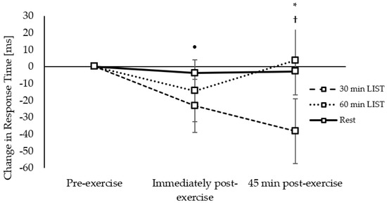 Response Times: On the one-item level of the Sternberg paradigm, response times slowed immediately following the 30 min LIST compared to both the resting control trial (trial × time interaction, t(5331) = −3.14, p = 0.002; Figure 4) and the 60 min LIST trial (trial × time interaction, t(5331) = −4.36, p < 0.001; Figure 4). However, 45 min post exercise, response times were improved following the 30 min LIST compared to the resting control trial (trial × time interaction, t(5331) = 3.62, p < 0.001; Figure 4), and tended to be improved to a greater extent following 30 min LIST compared to 60 min LIST (trial × time interaction, t(5331) = 1.74, p = 0.084; Figure 4), and following 60 min LIST compared to the resting control trial (trial × time interaction, t(3522) = 1.82, p = 0.069; Figure 4).