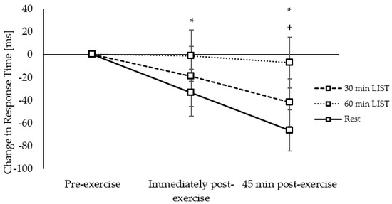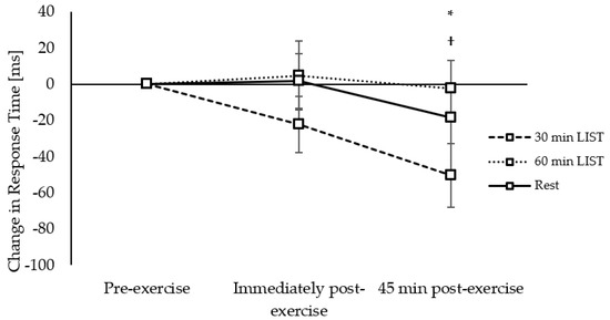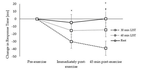 Response Times: Response times on the congruent level of the Flanker task were improved on the 30 min LIST trial immediately (trial × time interaction, t(10070) = −2.19, p = 0.029; Figure 8) and 45 min (trial * time interaction, t(10070) = −3.85, p < 0.001; Figure 8) post exercise compared to the resting trial. Furthermore, response times were improved to a greater extent 45 min post exercise on the 30 min LIST, compared to the 60 min LIST, trial (trial × time interaction, t(10070) = −2.57, p = 0.010; Figure 8).