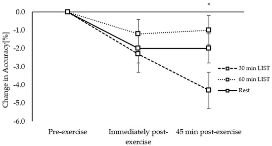 Change in accuracy across the morning on the 30 min LIST, 60 min LIST, and resting control trials on the three-item level of the Sternberg paradigm. Greater accuracy following 60 min vs. 30 min LIST *; p < 0.05.
