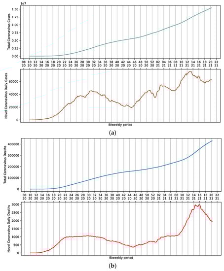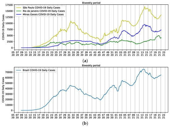 Biweekly cases of COVID-19 reported from epidemiological week five of 2020 to epidemiological week 22 of 2021. (a) States of São Paulo (yellow), Rio de Janeiro (Green), and Minas Gerais (Blue); (b) Brazil.