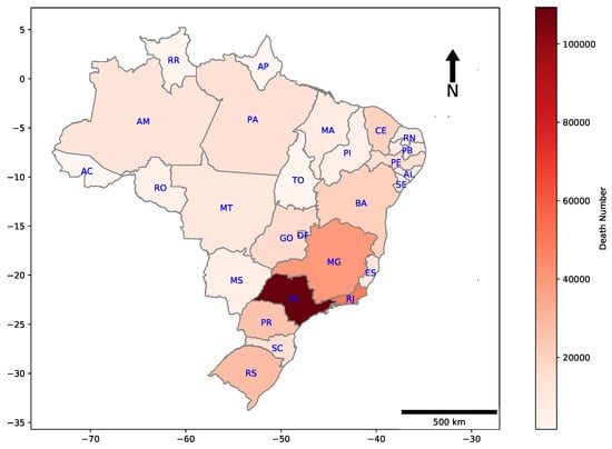 Geographic distributions for deaths by COVID-19 in all Brazilian states are shown in Figure 2. The majority of casualties are concentrated in the Southeast region of the country, which includes the states of Espírito Santo (ES), São Paulo (SP), Rio de Janeiro (RJ), and Minas Gerais (MG).