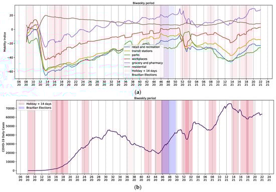 Brazilian Community Mobility Reports for retail and recreation, transit stations, parks, workplace, residential and grocery, and pharmacy during ordinary days and national holidays during the COVID-19 pandemic. (a) Community mobility reports and holidays; (b) biweekly reports of COVID-19 and holidays. Red represents the holiday plus 14 days; purple represents Brazilian elections. Mobility data provided by Google LLC.