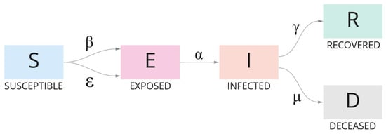 The Susceptible–Exposed–Infected–Recovered–Dead model, also known as SEIRD [24,25], is an epidemiological analysis based on the Susceptible–Infected–Removed model, known as SIR [26,27]. SEIRD is intended to enhance the SIR model in order to explain the evolution of a population in terms of transmissibility, contact rates, and the expected duration of infection in the course of an outbreak. Some assumptions must be made in SEIRD modeling:
