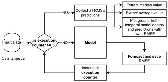 The aforementioned workflow is described in Figure 7. The model receives each set of input data, and the model’s expected outcome applied to the test data is subjected to RMSE calculations. After the process has been repeated 50 times, we distill a boxplot graph to observe which configuration performs better on average, observing the standard deviation and mean RMSE calculated. To create a temporal plot, comparing the ground truth (real values) and the model’s predictions, we choose the model with the lowest RMSE in forecasting COVID-19 deaths for each set of input configuration. For example, for all 50 repetitions using cases as input data, we plot the curve with the lowest RMSE.