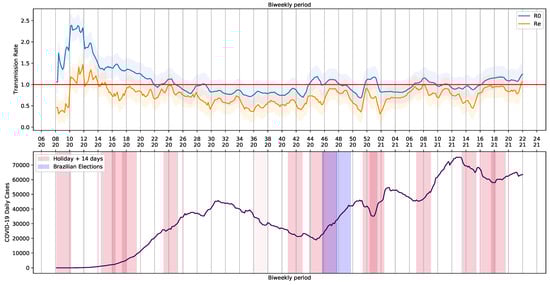 To generate the periodic data containing and , the pipeline was submitted to a loop process that consider a step of a day and take into account a period of 14 days (bi-weekly period). The extracted values are shown in Figure 8. The holidays and Brazilian elections over the COVID-19 daily cases curve are also shown in Figure 8.