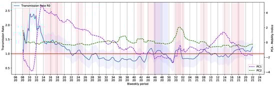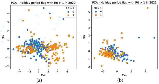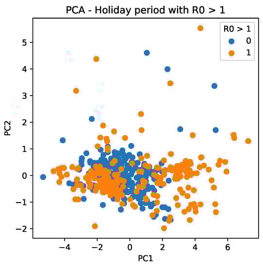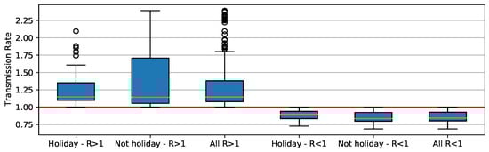 Applying the Mann–Whitney test [36], the p-values obtained for the null hypothesis were (1) H0 and (2) H0, whereas the significance is compared to the value being less than 0.05. The results support the idea that R > 1 on days that are in holiday periods, differing from days that are not in holiday periods. It also shows us that the R < 1 does not differ if the day is a holiday period or not.