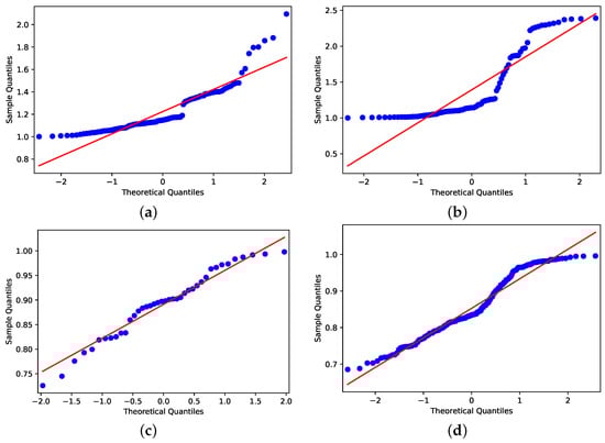 Shapiro–Wilk outcomes. (a) Holiday period with R > 1. (b) Not holiday period with R > 1. (c) Holiday period with R < 1. (d) Not holiday period with R < 1.