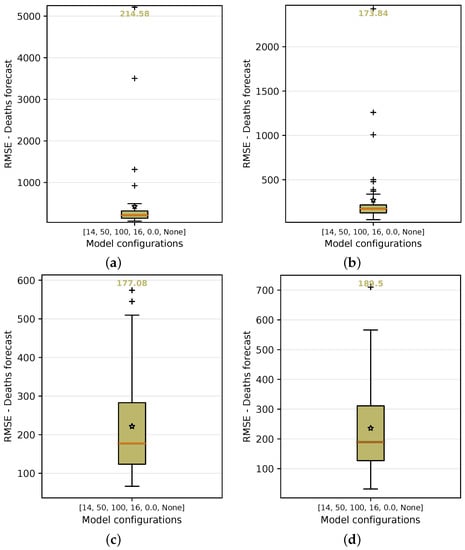 In order to test and choose for the best configuration, each of them is submitted to a grid-search process of training. In this process, they are executed 50 times and the forecast variations of each model are then analyzed using the test input data. By using the number of cases as the basis for predicting the number of deaths (baseline case), the median value of the results obtained from this method demonstrated that the median of the RMSE error is approximately 214.58 deaths over a 14-day forecast period, as shown in Figure 16a.