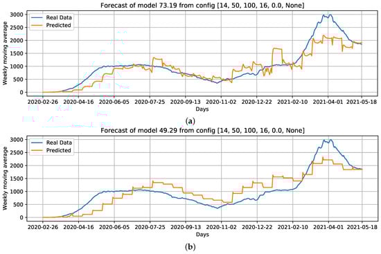 Table 6 lists the values for the other model configurations that were submitted to the process in the test-input-data step. As observed in Table 6, forecast was improved by adding the holiday flag to the one-variate model (configuration 2) that initially used only number of cases as input data. Another observation was related to the use of principal components as a substitute for the use of number of cases as input data. In these cases, we expected a reasonable forecast as an alternative to using only number of cases or some other data together with infected cases. Adopting only a dimensionless value of or , on the other hand, was not a reasonable approach, especially if one of them was associated with some holiday flags. However, using them as input data in groups and adding holiday flags helped the forecasting problem.