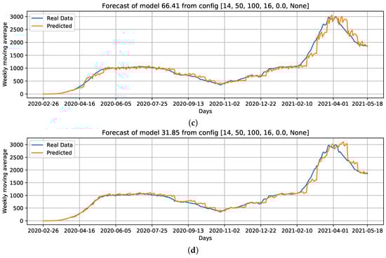 Other configurations, such as using the basic reproduction number (number of cases + ) as input data, yielded more accurate results, with an average recorded RMSE of 173.84 (Figure 16b), which was an improvement of 18.99% over the baseline using only number of cases as input data. The use of and with the holiday flag (Figure 16c) produced an RMSE median error of 177.08. This was another configuration that should be highlighted with a higher accuracy of 17.48% over the baseline using only cases as input data.
