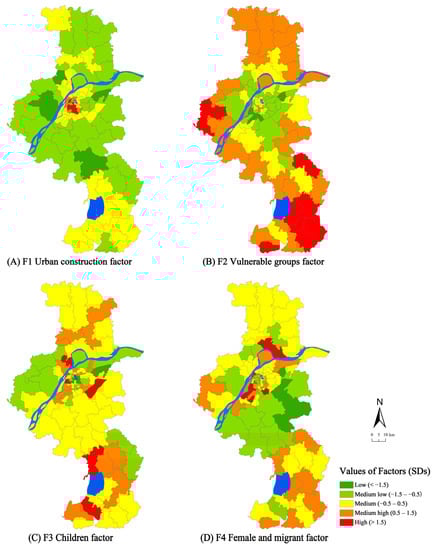 We analysed and interpreted the four factors to discover the spatial pattern of social vulnerability (Figure 3). The Urban Construction factor (Factor 1) was low in suburban areas but high in the urban centre. Public facilities and infrastructures tend to be high around the urban centre and low in exurban areas. When flood occurs, high-density construction areas and low-lying communities face substantial risk of loss []. The mid-value for exurban areas shows a lack of public facilities and a low risk of flood losses. Suburban areas have low-range scores. These areas also have sufficient public facilities and infrastructures, including good accessibility, compared with exurban areas, thus reflecting the relative correlation of the construction density and social vulnerability.