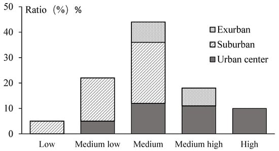 Secondly, public resource allocation should be planned and constructed in exurban areas. Most public resources are still mainly concentrated in the urban centre, such as medical care, infrastructure, and schools. The unbalanced distribution of public resources leads to continuous escalation in spatial heterogeneity and social vulnerability. As shown in this study, excessive public resources are located in the urban centre; attracting high-density populations increases the risk of flooding. People in the urban centre tend to live in welfare public housing, which was built in the 1980s and 1990s and lacks modern amenities and services, such as parking spaces, elevators, and property management []. Previous studies revealed that high-density neighbourhoods are vulnerable to catastrophic property losses []. The risk of urban flooding in exurban areas is also high. The high densities of children and females in exurban areas increase social vulnerability. The government should intervene by providing public resources to exurban areas to achieve spatial balance.