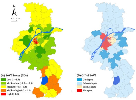 The Gi* of SoVI highlighted the agglomeration features in the urban centre; those in the vulnerable groups, such as children, the elderly, and rural immigrants in the urban centre, prefer to live in places with convenient public facilities and efficient schools and hospitals. Reversely, given that the densities of public facilities and infrastructures in suburban and exurban areas are low, the potential loss of flood is modest. As a result, it has a low value of social vulnerability. To put it in another way, the spatial heterogeneity of SoVI reflects social–spatial inequality. It can be defined as the disparities across cities in terms of economic, environmental, and social differentiation. The mismatch of public resource supply and demand aggravates social differentiation under the market-oriented reform.