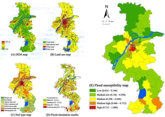 The ArcSWAT2012 software (USDA–ARS, Temple, TX, USA) based on the ArcGIS10.3 (Esri, Redlands, CA, USA) platform was used to simulate flood in Nanjing. DEM data, land use, soil type, and rainfall data were imported into ArcSWAT2012 for analysis. Firstly, we processed the data through ArcGIS10.3, a river grid file was converted into a vector file through the operation of ‘filled in’ (with the Z limit as 30 m) and ‘river network extraction’ (the confluence accumulation threshold was set as 1000) on the DEM map. Secondly, the DEM map and river vector file were imported into ArcSWAT for watershed division, and then hydrological response units were divided by importing land use, soil type, and slope data. Finally, the simulation results of runoff depth were obtained by inputting rainfall data. ArcGIS10.3 was used to overlap the runoff depth results with the neighbourhood areas of Nanjing. Nanjing was divided into 259 basins and 4754 hydrological response units. When runoff depth exceeds 0.4 m, it will cause severe urban flooding. Based on the calculated area ratios of neighbourhoods with a runoff depth exceeding 0.4 m, 99 neighbourhoods in Nanjing were divided into five levels of flood susceptibility (first decile: ‘low’, second decile: ‘medium low’, third decile: ‘medium’, fourth decile: ‘medium high’, and fifth decile: ‘high’).