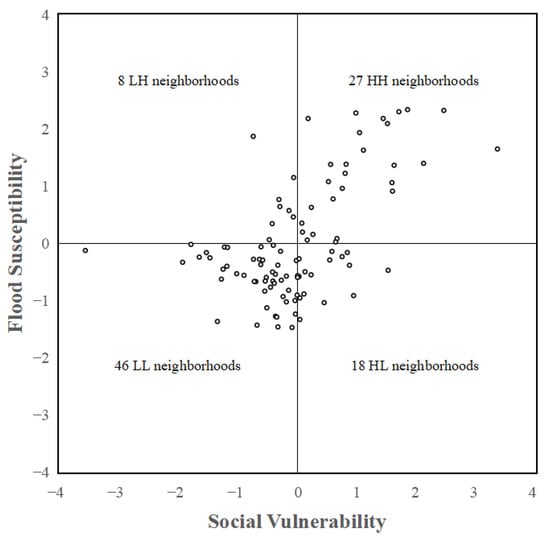 By analysing social vulnerability and flood susceptibility, the two are plotted in a 2D coordinate system. The result of person correlation is 0.560, indicating that social vulnerability is positively correlated with flood susceptibility. Most neighbourhoods are centralised in the L–L range (45.46%), then in the H–H range (28.28%). Only a few neighbourhoods emerge in the L–H range (8.08%) and H–L range (18.18%) (Figure 7). Four categories have been identified to explore the correlation between social vulnerability and flood susceptibility: