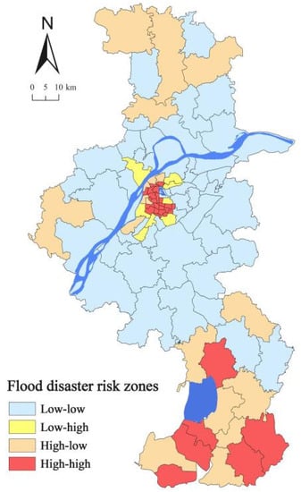 The last category is L–H range, which have low social vulnerability and high flood susceptibility. Of the 8.08% of neighbourhoods that have low social vulnerability and high flood susceptibility, most are located in the urban centre L–H range (Figure 8). These areas usually have a high level of economy, abundant public facilities, and high-income and highly educated people. Some rapidly urbanising neighbourhoods, such as the Xinlong neighbourhood in Hexi New Town, which is located in low-lying areas along the Yangtze River, have experienced severe flooding []. Nevertheless, people in the Xinlong neighbourhood have high income and high education. They have relatively low social vulnerability. Urban expansion must consider flooding when selecting new city sites, such as low-lying areas and those close to large waters. Drainage facilities require advanced planning and long-term maintenance to mitigate the risk of flooding [].