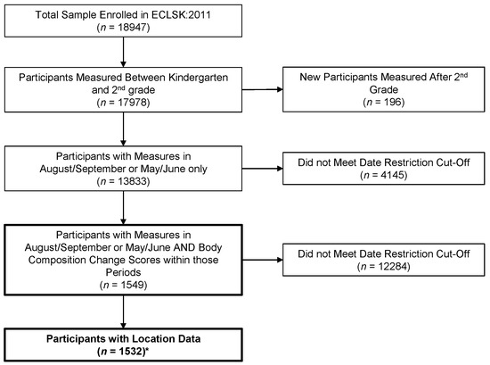 ECLS-K:2011 collected fall measurements from August to December and spring measurements from March to June []. A measurement occasion (i.e., month height/weight was collected) variable was included in the ECLS-K:2011 dataset. Because we aimed to estimate monthly school and summer changes in body composition, we restricted our analytical sample to children measured in August/September and April/May. This approach allowed us to examine differences in body composition change during school (more-structured) and summer (less-structured) without employing analytical methods that would predict all children’s height/weights at one specific time-period. After restricting the dataset to the defined months, we had an analytical sample of 1549 children. Figure 1 shows the flow of exclusions from the complete sample to the analytic sample.