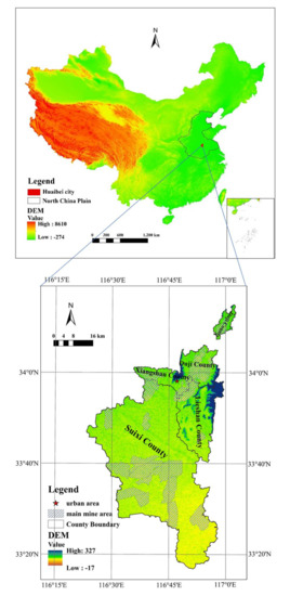 The North China Plain is low and flat, with the majority of its land under 50 m above sea level, and is the most populous plain, making up approximately 24.2% of the total population in China. It is also the major grain-producing area, and an important high ground water area in China. As a typical mine–grain mixed zone, the North China Plain produces both coal and grain [20]. Huaibei City, a city of Anhui Province, is located in the North China Plain (Figure 1).