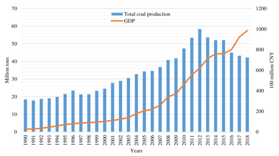 The total coal production and GDP in Huaibei City from 1990 to 2018.