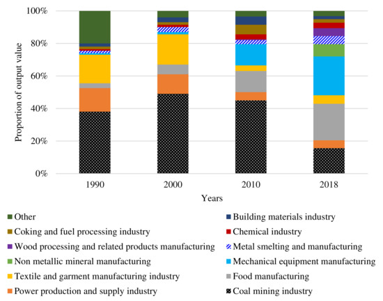 Huaibei City’s underground water level is 2–3 m, the annual average temperature is 14.5 °C, and the annual average amount of precipitation is 862.9 mm. As a coal–grain mixed zone in high ground water areas, land use in Huaibei prioritizes agriculture before coal mining development. With the development of coal mining, the coal industry has gradually become the pillar industry in the economic development of Huaibei since the 1990s. After 2010, the city entered a transition period, and the proportion of coal industry output value gradually decreased (Figure 3). With constant large-scale coal mining, the cultivated land is in the process of dynamic subsidence, which further results in waterlogging and becomes a water body, increasing the proportion of affected cultivated land. In the future, coal resource mining activities will continue, and their impact on land use will continue to exist.