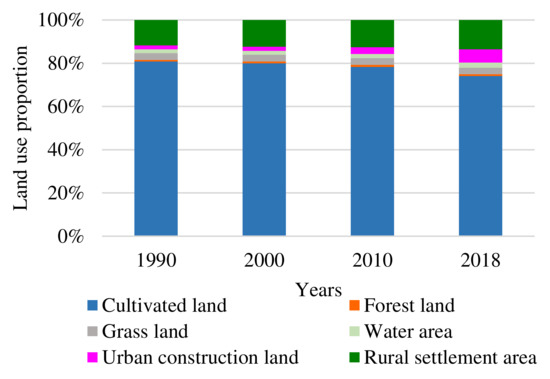Land has always been a crucial resource for human existence and development, and acts as the base and carrier that support human activities [1,2,3]. Land use change is a long-term activity that is based on certain social and economic aims. As an important research area of global change science and sustainable science, it is the most direct representation of terrestrial ecosystem change and the influence of human activities on the earth’s surface system [4,5,6]. The measurement of land use change is a significant part of land resource management and observation. However, most studies often focus on the analysis of land use change on large scales, such as global, region, country, basin, island, or peninsula scales, while less attention is given to land use change on small scales in city or rural areas. Land use change is mainly caused by the complex interaction of human activities and ecological and social factors [7,8]. Present studies mainly probe the influence of macro human activities, such as urbanization and industrialization on land use change [9], while showing less interest in the micro driving force of regional land use change. Due to the difference between different types and degrees of human activities, as well as the heterogeneity of the earth’s surface, land use changes in various areas also present different characteristics and regularities. In this regard, it is important to explore the dynamic change regularities of typical regional land use to promote sustainable regional land use, to further achieve the United Nations (UN) Sustainable Development Goals.