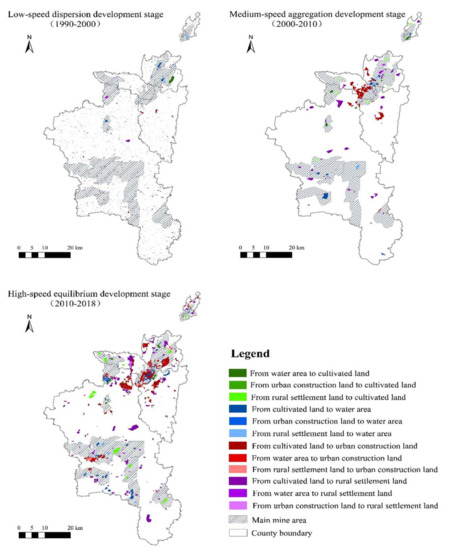 Based on the analysis of total coal production, different land use type change and socio-economic development background in research area over the years (Figure 4), this research proposes that the land use change is generally divided into three stages, including low-speed dispersion development stage, medium-speed aggregation development stage, and high-speed equilibrium development stage. (1) During the low-speed dispersion development stage (from 1990 to 2000), the speed of land use change was low, and the development in coal resource-based cities mainly focused on the coal mining industry. Under the mainly influence of China’s planned economic system, Huaibei City had a single industrial structure (Figure 3), and the extent of the city’s economic development was low. The mining scope of this stage is small, and the influence of mining activities on the overall pattern of land use is not significant. (2) In the medium-speed aggregation development stage (from 2000 to 2010), the overall speed of land use change was faster. In the context of China’s market economic system, the development of the coal industry and non-coal industry is accelerating in the city. Coal production increased from 24.59 million tons in 2000 to 47.35 million tons in 2010, and industrial output increased from CNY 3.84 billion in 2000 to CNY 27.37 billion [21]. The development of the industry has led to the expansion of the city’s economic scope and population concentration. The urbanization process in Huaibei has accelerated, with the number of urban residents increasing from 0.73 million in 2000 to 1.161 million in 2010, which further promoted the rapid transformation of land types, such as cultivated land into urban construction land. (3) During the high-speed equilibrium development stage (from 2010 to 2018), the speed of land use change accelerated significantly. The total coal production first increased and then decreased, coal-related industries gradually declined, and the effect of coal resources on land use change was also weakened due to coal resource reserve shortages. However, under the influence of the central government support policy (by 2018, Huaibei City has received a total of approximately CNY 5.4 billion in financial transfer funds from the state), the city has carried out transformation and upgrading, the speed of urban construction has accelerated, and changes of the various types of land use in the city have been drastic.