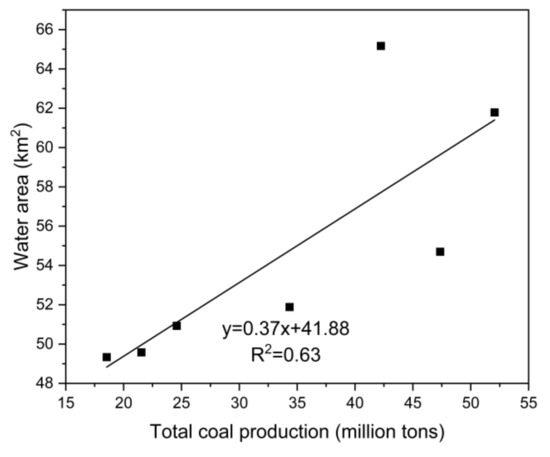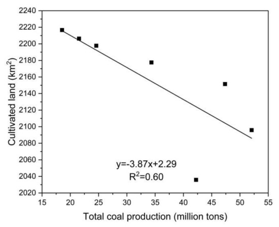 Coal mining is the most prominent driving force of land use change in resource-based cities. Different from other city types, the development of coal resource-based cities presents significant resource-related reliance and orientation, and coal mining causes changes to the region of different land use types. Therefore, this paper analyzes the relationship between total coal production and cultivated land, forest land, grass land, water area, urban construction land, and rural settlement land in 1990, 1995, 2000, 2005, 2010, 2015, and 2018, respectively. This paper concludes that cultivated land, water area, and rural settlement land correlate significantly with total coal production (Figure 6, Figure 7 and Figure 8). There is a significant positive correlation between water area and total coal production (r = 0.791, p = 0.034), rural settlement land, and total coal production (r = 0.863, p = 0.012), and a significant negative correlation between cultivated land and total coal production (r = −0.773, p = 0.042). However, there is no significant correlation between urban construction land and total coal production (r = 0.712, p = 0.072), forest land and total coal production (r = 0.744, p = 0.055), and grass land and total coal production (r = −0.673, p = 0.097). These results demonstrate that constant coal mining and the accumulation of total coal production contribute to the continuous expansion of water area and rural settlement land, as well as a constant decrease in cultivated land in the research area.