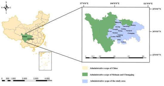 Based on the “Chengdu–Chongqing Urban Agglomeration Development Plan” issued by the National Development and Reform Commission and the Ministry of Housing and Urban–Rural Development, this paper takes 14 prefecture-level cities in Sichuan Province, Chengdu, the capital of Sichuan Province, and Chongqing, the municipality directly under the central government, as the research objects. The research period is set from 2009 to 2018. Considering that this paper focuses on the development of the whole urban agglomeration led by Chengdu and Chongqing, as well as the size of Chongqing and the lack of data, all districts and counties in Chongqing are combined and treated as an evaluation unit. Considering the desirability and scientific aspects of the original data, in this paper, the ecological environment and social-economic statistics are derived from the China City Statistical Yearbook, Sichuan Statistical Yearbook, Chongqing Statistical Yearbook, and the statistical bulletins of various cities and government work reports. The missing values are predicted and supplemented by linear regression. Quantitative analysis, spatial analysis, and spatial visualization processing of the data are undertaken with the help of SPSS, ArcGIS, Stata, and other software.