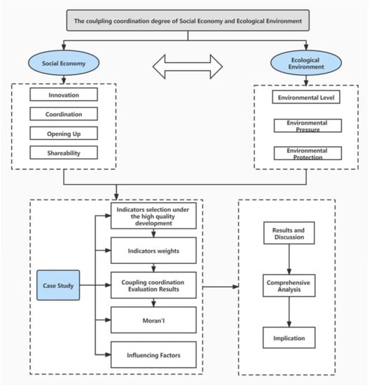 In order to research on the coupling coordination relationship of social economy and ecological environment, this study determined the indexes under the concept of high-quality development, and then calculated the index weights. Based on SPSS 21.0 statistical analysis software, we made a comprehensive analysis to measure the coordination degree and the coupling coordination degree of social economy and ecological environment. Then, the Moran index was calculated based on ArcGIS 10.4 software and analysis the CCD characteristics from the perspective of time and space. The factors influencing CCD were determined by Stata15.1. Finally, we present a comprehensive analysis and discussion in this paper according to the results. The specific implementation steps are as follows (Figure 3).