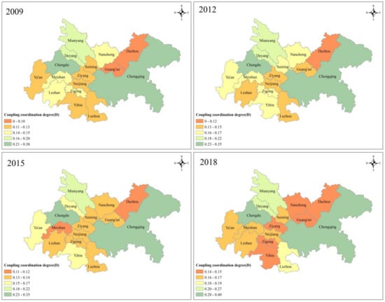 According to previous studies, the CCD can be classified according to the level, as shown in Table 4. Certainly, most cities have not shown coordination in terms of social economy and ecological environment in the past decade. Since 2009, the CCDs of various cities has been gradually increasing with Chongqing, Chengdu, Mianyang, and Deyang at the forefront of growth, while the growth rate of other cities is relatively low.