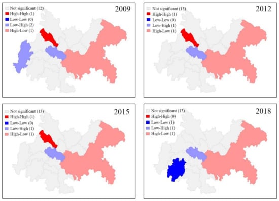The LISA agglomeration map of 2009, 2012, 2015, and 2018.