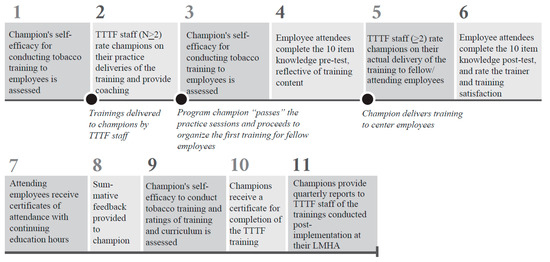 The train-the-trainer program was implemented in a series of steps (see Figure 1 for a summary). The implementation period ranged from 4 months to 6 months between participating LMHAs. Given COVID 19-related concerns, all training activities, originally designed to be delivered in-person, were conducted live, via Microsoft Teams and/or Zoom, to allow interaction and discussion between trainers and trainees, and all data collection was accomplished electronically via Qualtrics or email. Following a self-assessment of champions training self-efficacy (Step 1; see Figure 1), TTTF provided a 4–5 h comprehensive training to the champions on tobacco use and treatment for individuals with behavioral health treatment needs. On a separate occasion, TTTF staff next delivered a scaled down, 90-min version of the training to reinforce knowledge and provide champions a model of the training they would conduct. Thereafter, the TTTF staff observed the champions practice deliver the 90-min presentation twice (on separate occasions) to no audience or to a small audience of other champions. Each time, champions were provided oral and written (i.e., rater forms) feedback from TTTF staff. Champions could not proceed to training LMHA employees (i.e., actual trainings) until they had reached “very good” or “excellent” ratings by TTTF observers on delivery of the training curriculum and effectiveness as a trainer. Various tips were presented throughout the training process, along with coaching on how to improve presentation (Step 2). Prior to actual training delivery, champions again rated their training self-efficacy (Step 3). Champions then delivered 2 actual trainings to a group of their LMHA’s current employees, all of whom were either highly encouraged or mandated to attend. Attending employees completed a pre-training knowledge test (Step 4) and attending TTTF staff provided ratings of the champion’s delivery (Step 5). After the training, employees completed a post-training knowledge test and provided ratings of the champion’s performance and their satisfaction with the training itself (Step 6). Attending employees received a certificate (Step 7) and summative feedback was provided to champions in written form that included a summary of knowledge gained by attending employees, as well as TTTF staff and employee ratings of the training (Step 8). Thereafter, the champions again rated their training self-efficacy, and their satisfaction with their training experience with TTTF and the provided curriculum (Step 9). Champions then received a program completion certificate from TTTF (Step 10). This marked the end of the program implementation, after which data were collected quarterly from the champions with regard to additional employee trainings provided (Step 11).