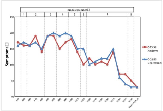 Additionally, the same rater used a structured interview guide for the Hamilton Anxiety Rating Scale to measure global anxiety symptoms (SIGH-A) [34] and the GRID-Hamilton Depression Rating Scale (GRID-HAMD) to measure severity of depression [35,36]. The assessors had received at least 15 h of training on each of SIGH-A and GRID-HAMD and had passed a practical exam involving assessment of a videotaped patient with at least 80% concordance with the gold standard score. The client’s scores of SIGH-A and GRID-HAMD scores at baseline were 33 and 22, respectively, indicating severe symptoms. On self-report scales at baseline, the client scored 76 points on the Impact of Event Scale-Revised, 53 on the Beck Depression Inventory-II (severe) [37], and 23 on the Sheehan Disability Scale [38,39].