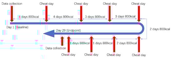 The IER strategy would be conducted in the form of “Diet Refeeds”. Traditionally, the Diet Refeeds was an energy restriction strategy with a daily energy intake that reaches a specific target of calories and nutrients below their estimated weight maintenance energy requirements for 1–3 days [2], and then have a cheat day, which is an entire day of eating without regard to quantity or nutrient composition. However, according to the desire of the participants, which was to lose bodyweight as quickly as possible, the Diet Refeeds strategy used in this trial would let the participants in IERG intake 800 kcal in each energy-restricted day, which was an extremely low daily energy intake, with an error tolerance at 40 kcal. The intake may be measured at the end of each day, there are no predetermined goals to achieve in terms of nutrient intake. Cheat days might include a string of cheat meals and most likely result in a significantly higher than normal consumption of calories that usually come from carbohydrates and fats. In IERG, each day with an energy intake from 760 kcal to 840 kcal would be regarded as a “valid day”, as well as each cheat day with a report of energy intake and physical exercise. The progress is provided in Figure 1.